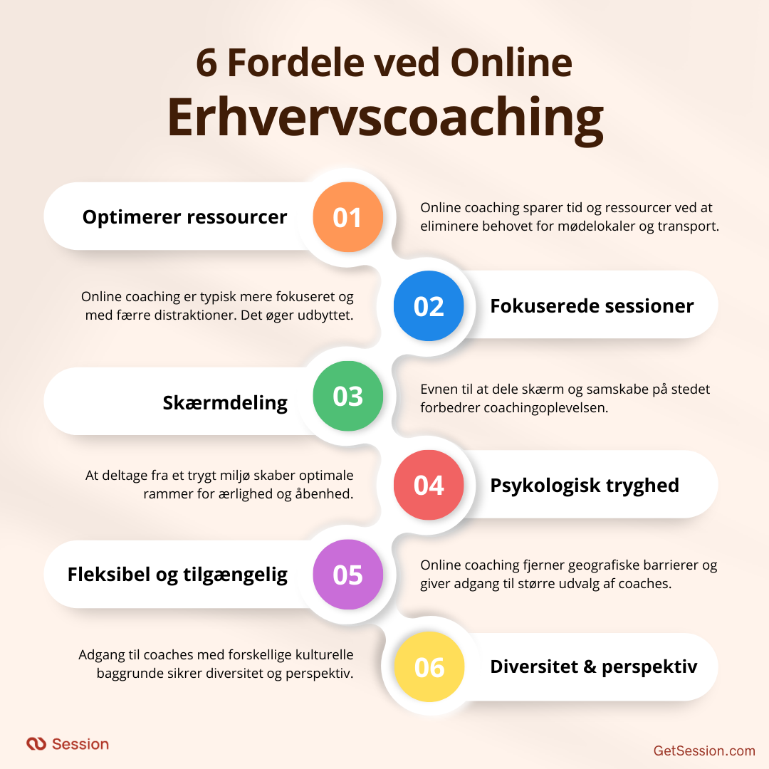 - Mangfoldighed – Uden grænser åbnes sindet for nye perspektiver. Online coaching kan foregå på tværs af landegrænser, kulturer, og normalt tilgængelige muligheder. Banebrydende, innovativ coaching er lige ved hånden - du kan blive udfordret af perspektiver og af en coach, du ellers ikke ville have haft mulighed for at møde.